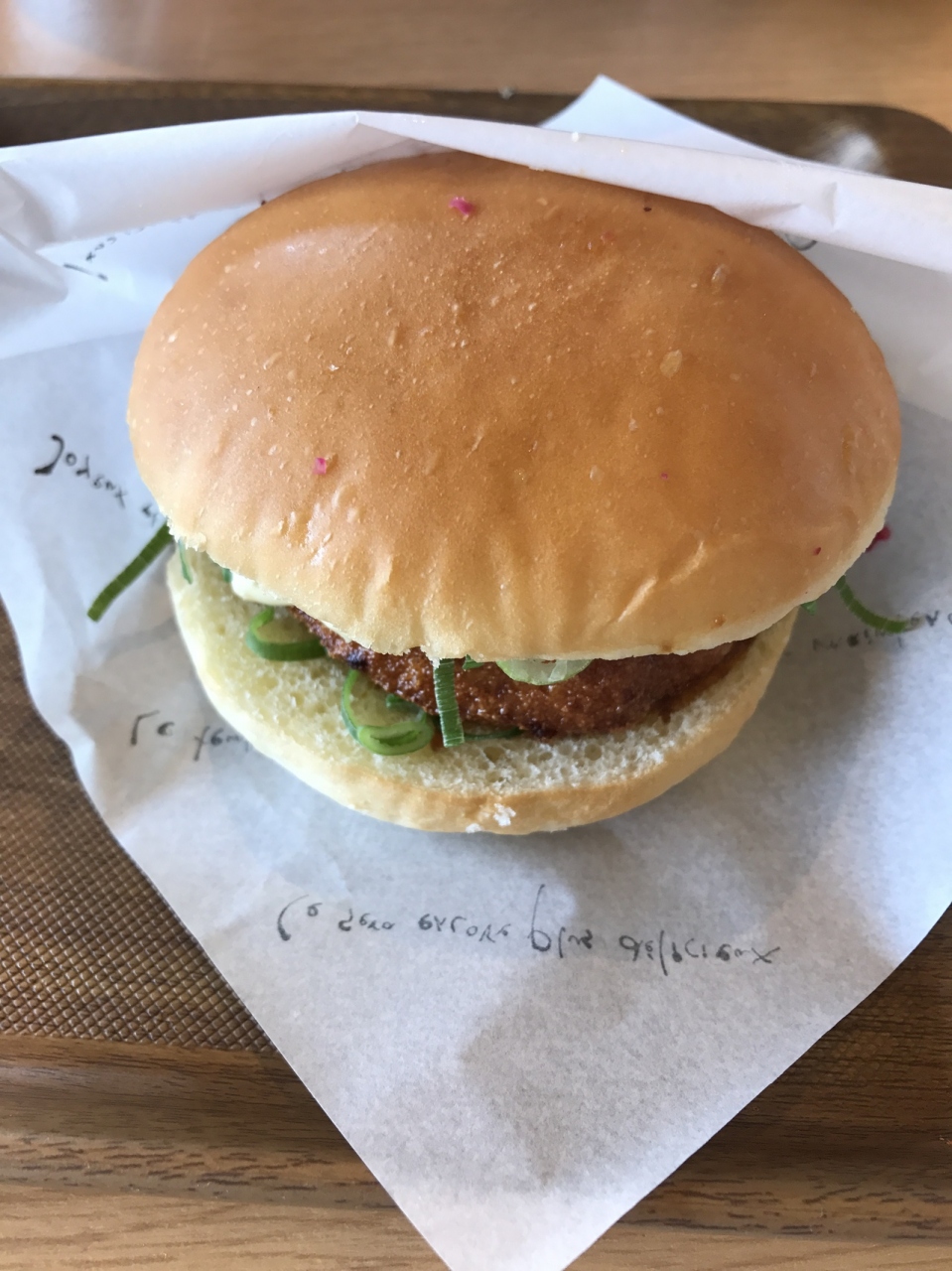 豆腐パテの他に、九条ネギやしば漬けが挟まっている和風バーガーで、