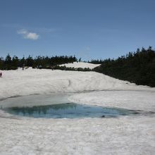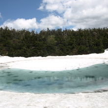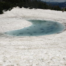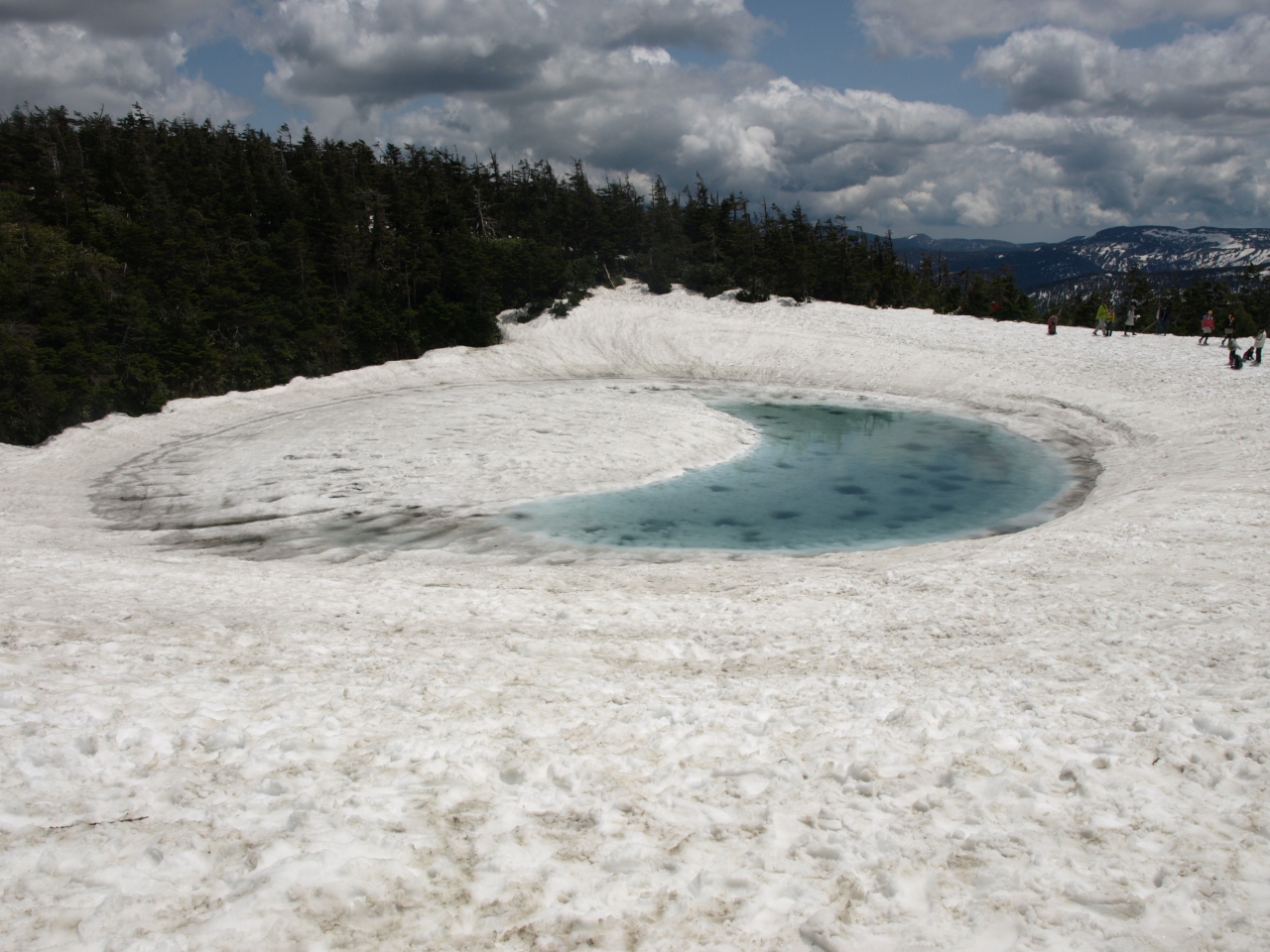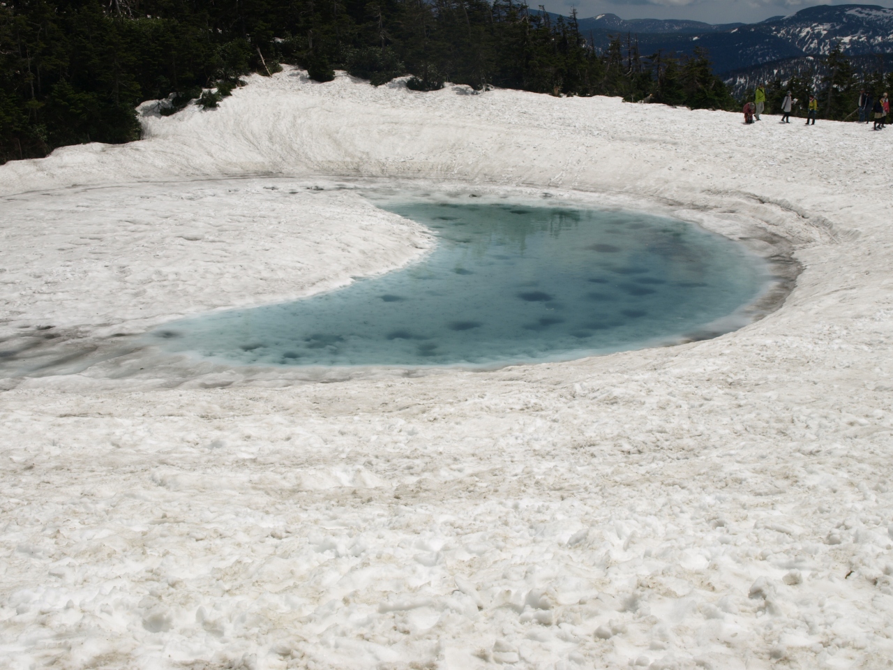 八幡平頂上のバス停とレストハウスから頂上までは片道30-40分程度、行きは鏡沼経由がなだらかでよい。そこには、ドラゴンアイなるものが。5月下旬から1か月弱の限定で出現。その期間は、盛岡から自然散策バスもあり無料とうれしいガイドもある。