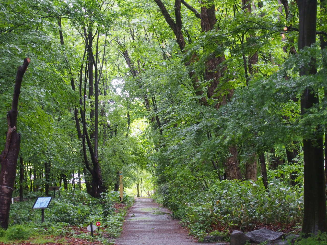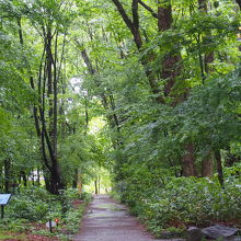 弘前公園の南東側のほとんどを占める場所に弘前城植物園があります。通路は碁盤目状に整備されて、歩きやすくなっています。弘前、津軽の植物などが植えられていて、地元の植生がわかりやすくなっています。また白神山地の木々、植物もありとても興味深ったたです。多くの人が訪れる桜の時期は過ぎていましたが、新緑の美しい季節で、植物園の木々も美しく輝いていました。