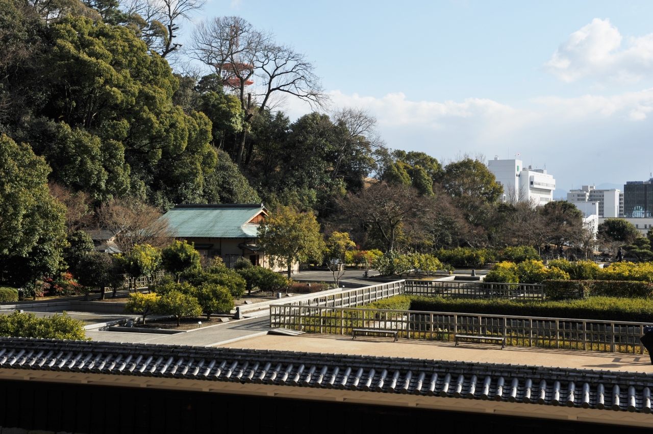 松山城二之丸跡の敷地に整備された。古い絵図や調査に基づき、藩主の邸宅だった二之丸の間取りが再現され、その中を水が流れる「奥御殿跡流水園」が美しい。さらに「林泉庭」「大井戸」の遺構など見どころがある。結婚式の前撮りの場所として年間500件ほどの撮影が行われており、2013年に「恋人の聖地」に認定された。松山城天守閣を挟んでロープウエー・リフトと反対側にあるので、旅程に工夫がいりそうだ。この日は東雲神社に参拝した後に天守閣まで上り、二之丸公園までは下りのルートをゆるりと歩いたので、一筆書きの旅程が組めた。