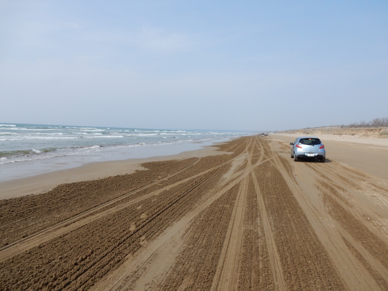 クルマが走るエリアは結構砂が固くなっており、ホント普通の道に近い感じで走行ができます。注意は波打ち際と路肩の砂が締まっていない所。前者はタイヤの溝が少ないと空回りする可能性がありそうです(ダート道で空転している車がたまにいますが)。後者は溝に関係なく空回ってしまうかも。