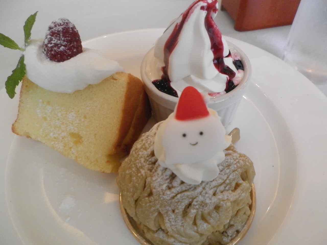 好きなケーキ1個、シフォンケーキ、ソフトクリームが1プレートになったケーキセットが617円、もちろん好きな飲み物も付けられます。