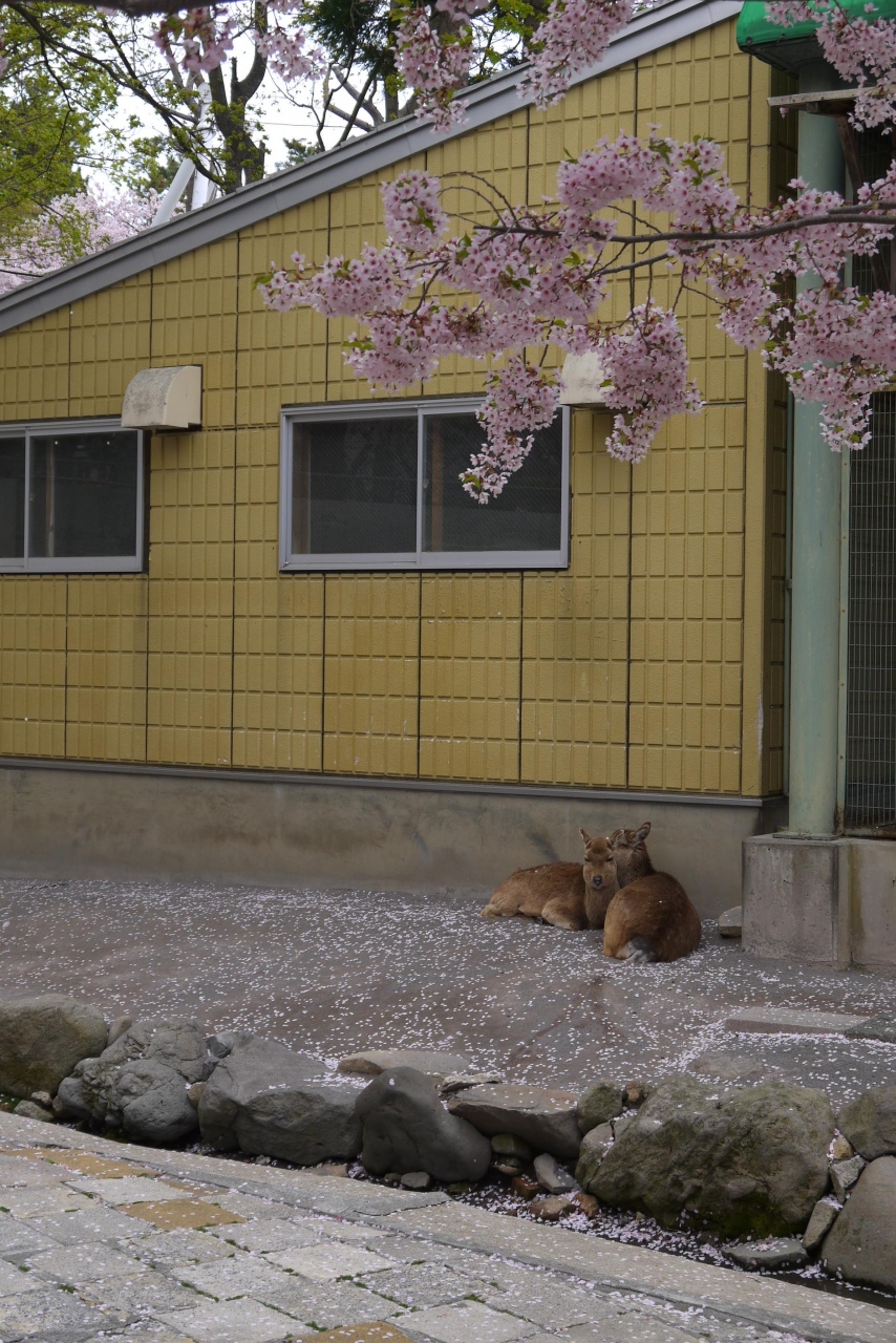 ちょうど桜の季節だったので、屋台が出ていたり幼稚園の遠足があったりと、にぎやかなはずなのですが、どんどん天気が悪くなりドヨーンとした感じになってしまいました。散る桜の下、鹿も寒そうな様子で…。