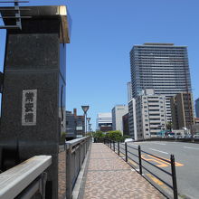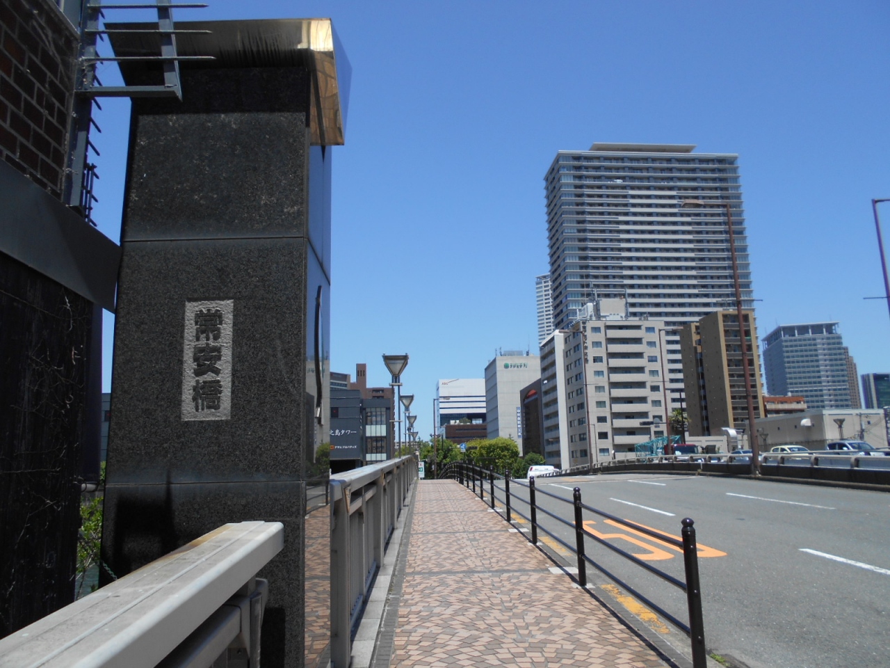 中之島と土佐堀、江戸堀結ぶ土佐堀川にかかる橋です。広く整備された橋で車が多く通っています。周囲はレトロな建築もありますが新しいタワービル、マンションなどが多いところで、都市というかんじがします。橋のすぐ近くに食品スーパーがあるのが少し不思議なかんじです。