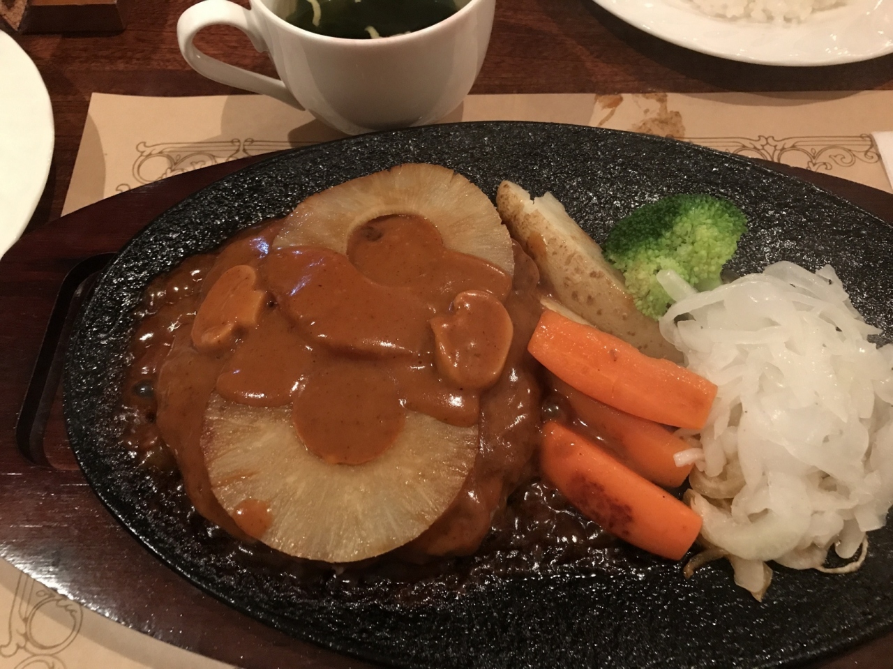 私はパイナップルハンバーグ、家族は和風ハンバーグ。熱々ハンバーグが鉄板に乗ってやってきました。最後まで熱々ジューシーなハンバーグを堪能しました。大満足のハンバーグでした。ライスのお米も美味しいですよ