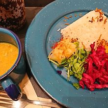 ごはんもピラミッドみたいによそわれ、青いお皿とカレーと色鮮やかなデリが女性が喜びそうなお料理です。