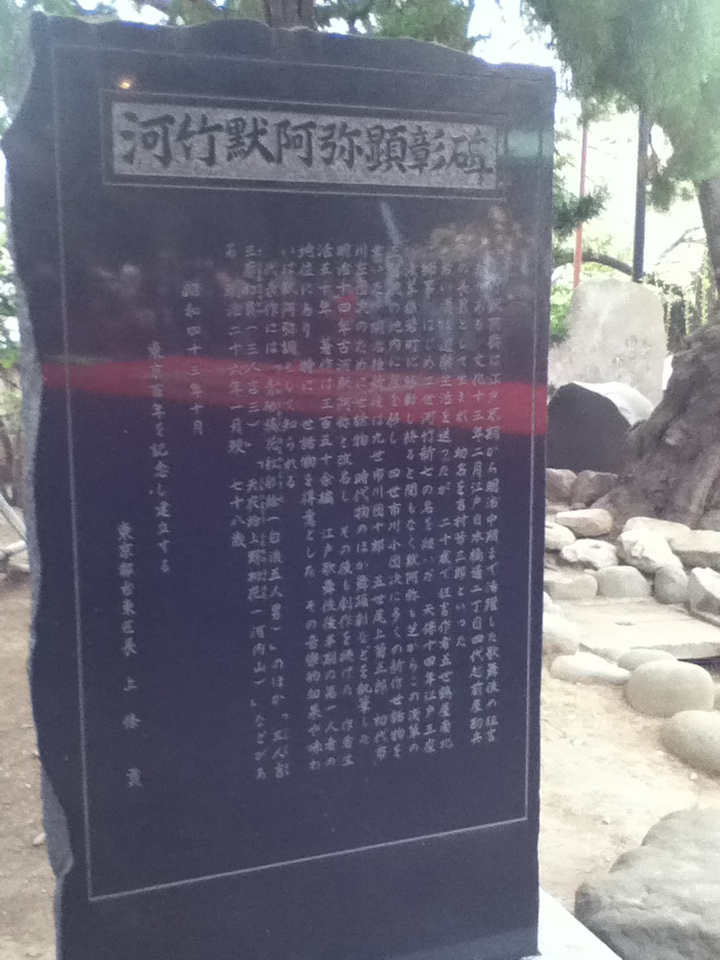 浅草寺の本堂左側のエリアにある。数人が写真を撮っていた。お勧めの点は、河竹黙阿弥は江戸末期から明治中期まで活躍した歌舞伎の狂言作者であること、正智院の地内に住み江戸時代には四世市川小団次に多くの新作世話物、明治維新後は九世市川団十郎 五世尾上菊五郎 初代市川左団次のために世話物 時代物のほか舞踏劇などを書いたこと、代表作に「青砥稿花紅彩絵(白浪五人男)」があること、石碑は名称や説明文がしっかりと刻まれていて読みやすいこと、説明文を読みながら河竹黙阿弥が白浪五人男などを書いていた様子や白浪五人男が上演された様子を楽しく想像するのもいいかもしれないことである。