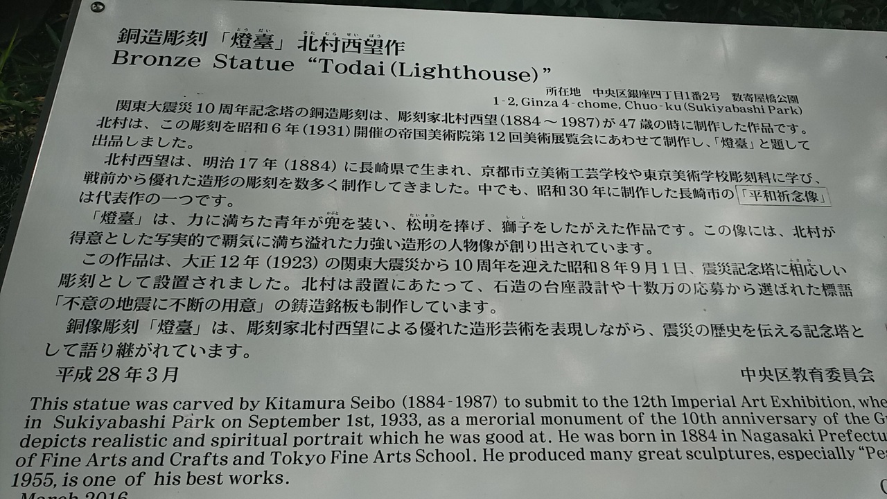 実は何十回何百回もここを通り、喫煙所(以前はここで煙草が吸えたのですが・・・)で家人と待合せしているのに、関東大震災10周年記念碑があることを今朝まで知らなかったのですρ(・・、) あぁ恥ずかしい!