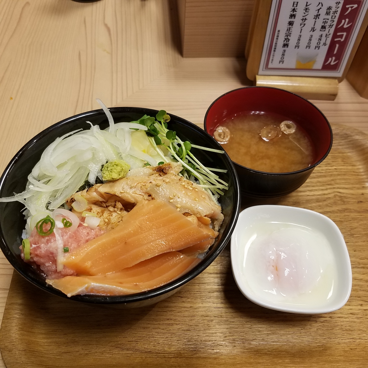 炙りサーモンとネギトロがのった丼に温泉卵をトッピングしました。