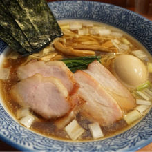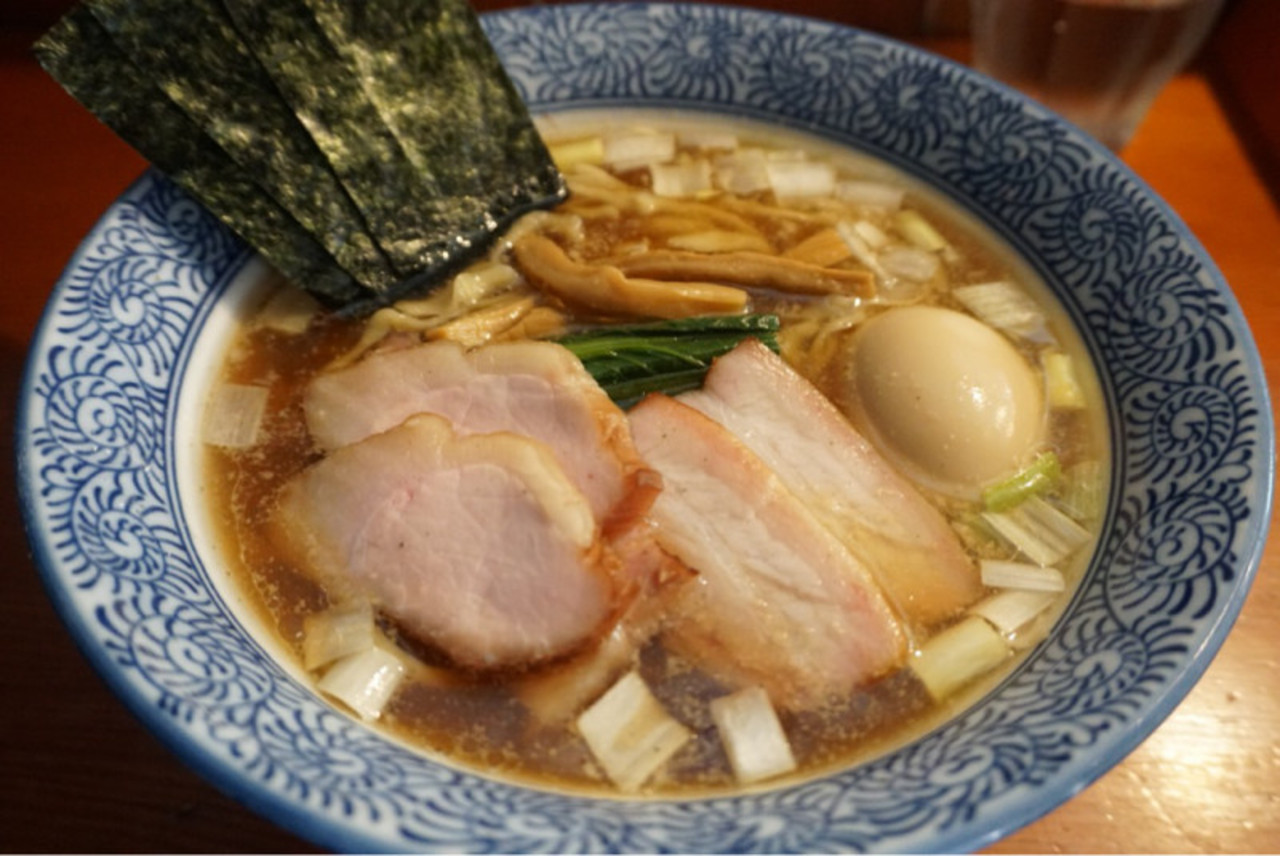 ラーメンのシルエットはこんな感じ。透明感のあるスープの上には、チャーシューが2種、メンマ、小松菜、味玉、海苔が盛り付けられ、ネギを印象的にちらしてあります。透明感のある見た目通りの優しい醤油スープだが、鶏の旨味がきっちり感じられる仕上げになっております。