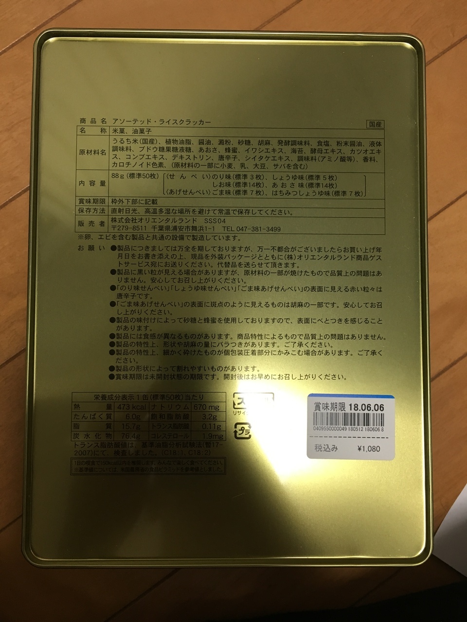 職場へのお土産にこちらでお菓子を購入しようと利用しました。園内で買い忘れてしまいましたが、舞浜駅から少しランド側に歩けば良く、23時まで空いているため助かりました。小さな一口サイズのおせんべいがたくさん入っているのでバラマキ土産に最適でオススメです。