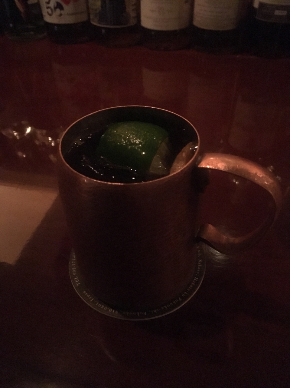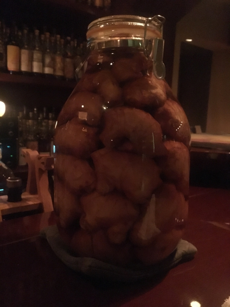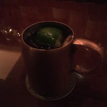 店内にはショウガを漬けている大きな瓶があちこちにある。このショウガをカットしてライムと共に銅製のマグカップに入れて出てくるのが