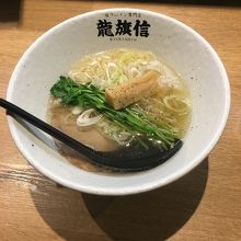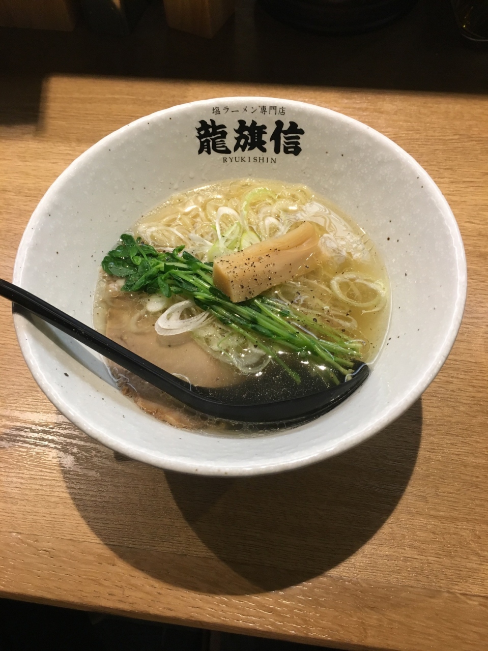 新大阪駅の地下にあるエキマルシェで食べられる、堺が本店の有名塩ラーメン専門店。アクセスが良いのが嬉しい。店内はカフェみたいな感じだが、れっきとしたラーメン店。塩ラーメンは800円。キレイな黄金色のスープはあっさりとしていて美味しい。