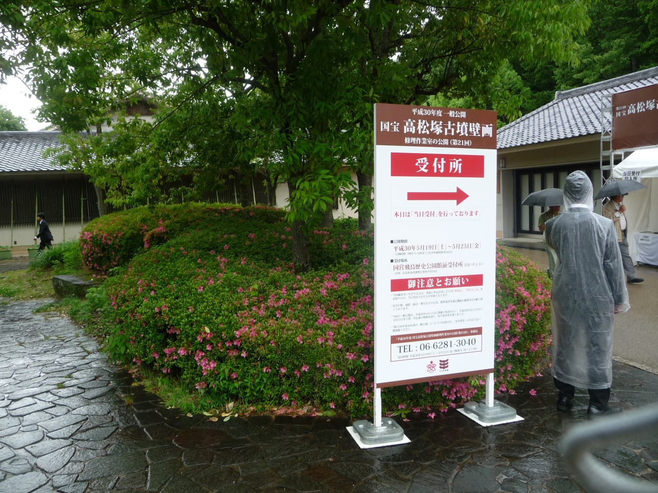 この、公園館に付随して建物裏手に文化庁・高松塚壁画の修理作業室があり、今回期間限定・予約制で「壁画の修理作業室公開」が催され、これに参加した。初めに講義・事前説明を受け、次に作業室内部を遮断ガラス越しに双眼鏡を用い、眺めた。(作業室内は壁画の劣化防止のため、完全密閉。気温21度、湿度80%を維持)。公開・見学はわずか10分であったが二度とみられぬオリジナルの高松塚壁画を見ることができ、感激した。