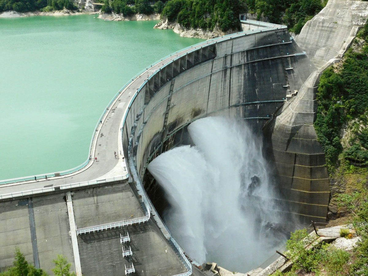 上から黒部ダムを見ることのできる場所です。ダム堤体を一望することができ、深い谷に聳え立つ黒部ダムの巨大さが解ります。
