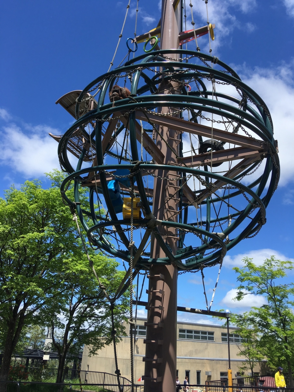 支柱に球体の遊具が地面から立っており、その上にオラウータンがいるんです!