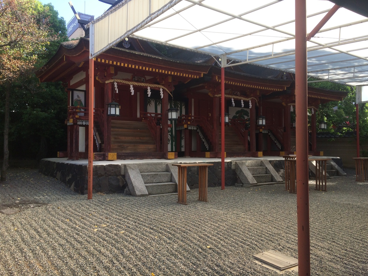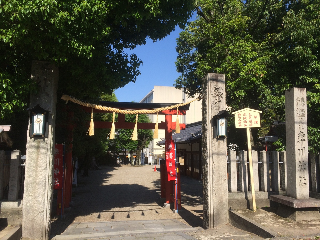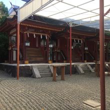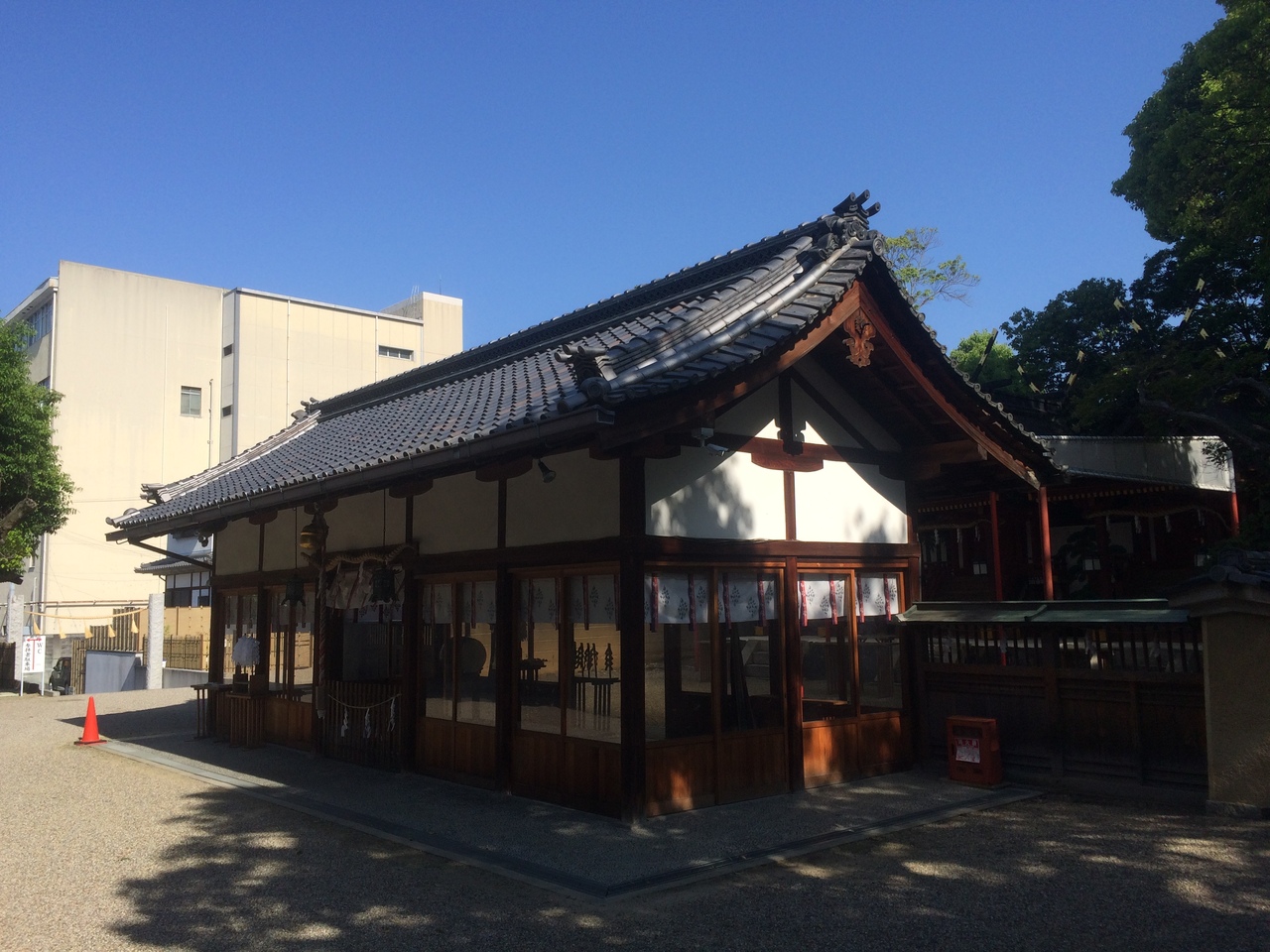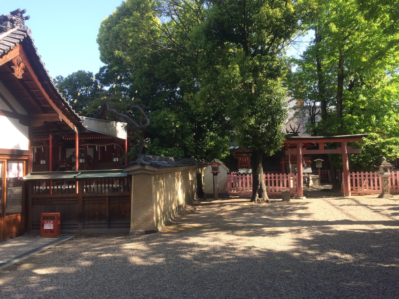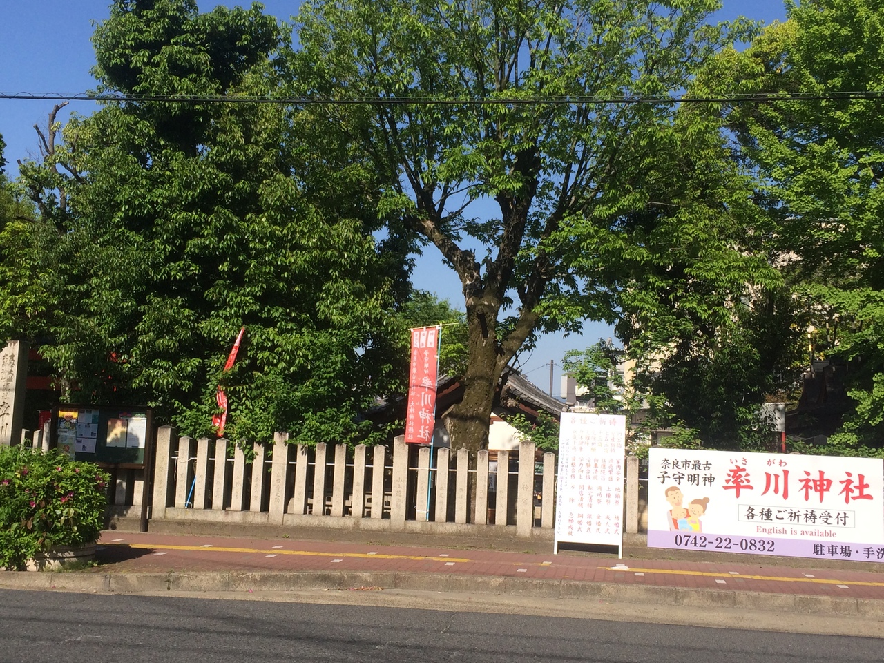三棟の本殿があり、左側には父神、右側には母神、中央には子供を祀っていて両親が寄り添うようにしているので子守りの神社と言われています。訪問時にも幾人か子供連れがいました。境内に生えている木々の緑の新緑が印象的でした。