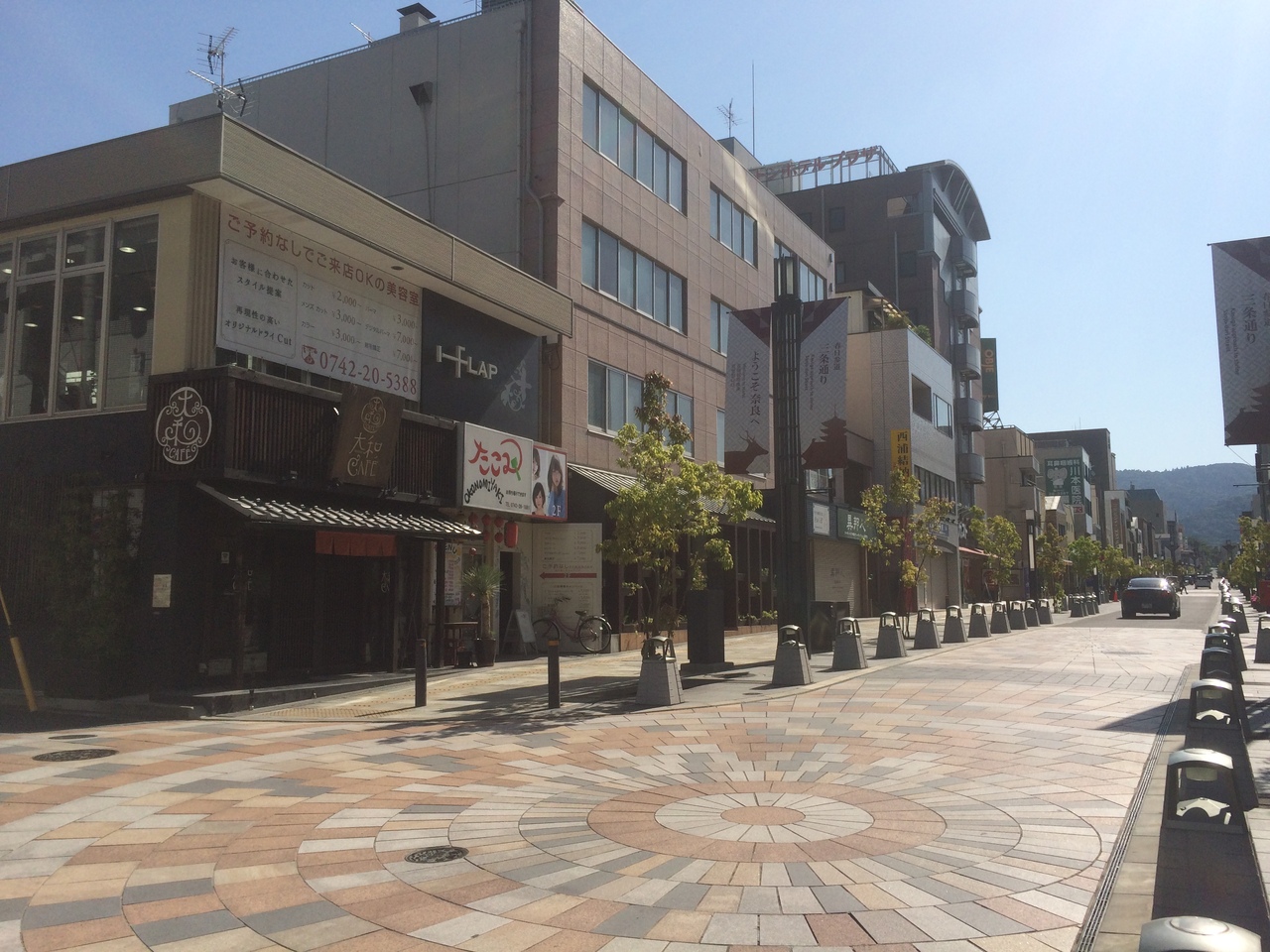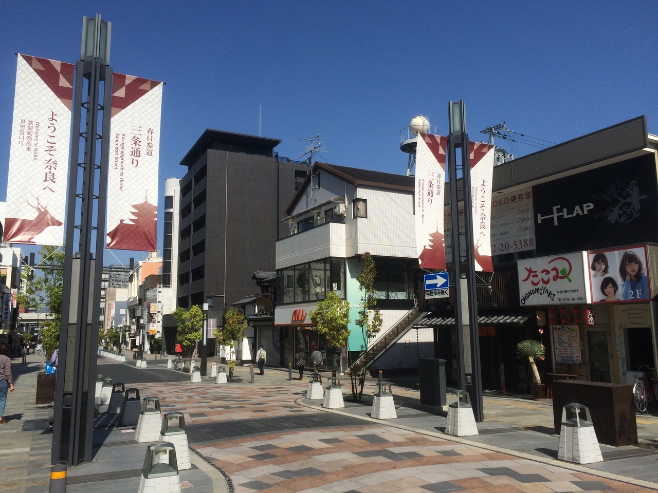 JR奈良駅付近から興福寺方面までの通りで、ごちゃごちゃ感がなく歩くにはすがすがしい道でした。店も良い間隔で離れていてコンビニ等もあります。車道が中央にあり歩行者道は左右にありますが、交通量も多くない道でした。