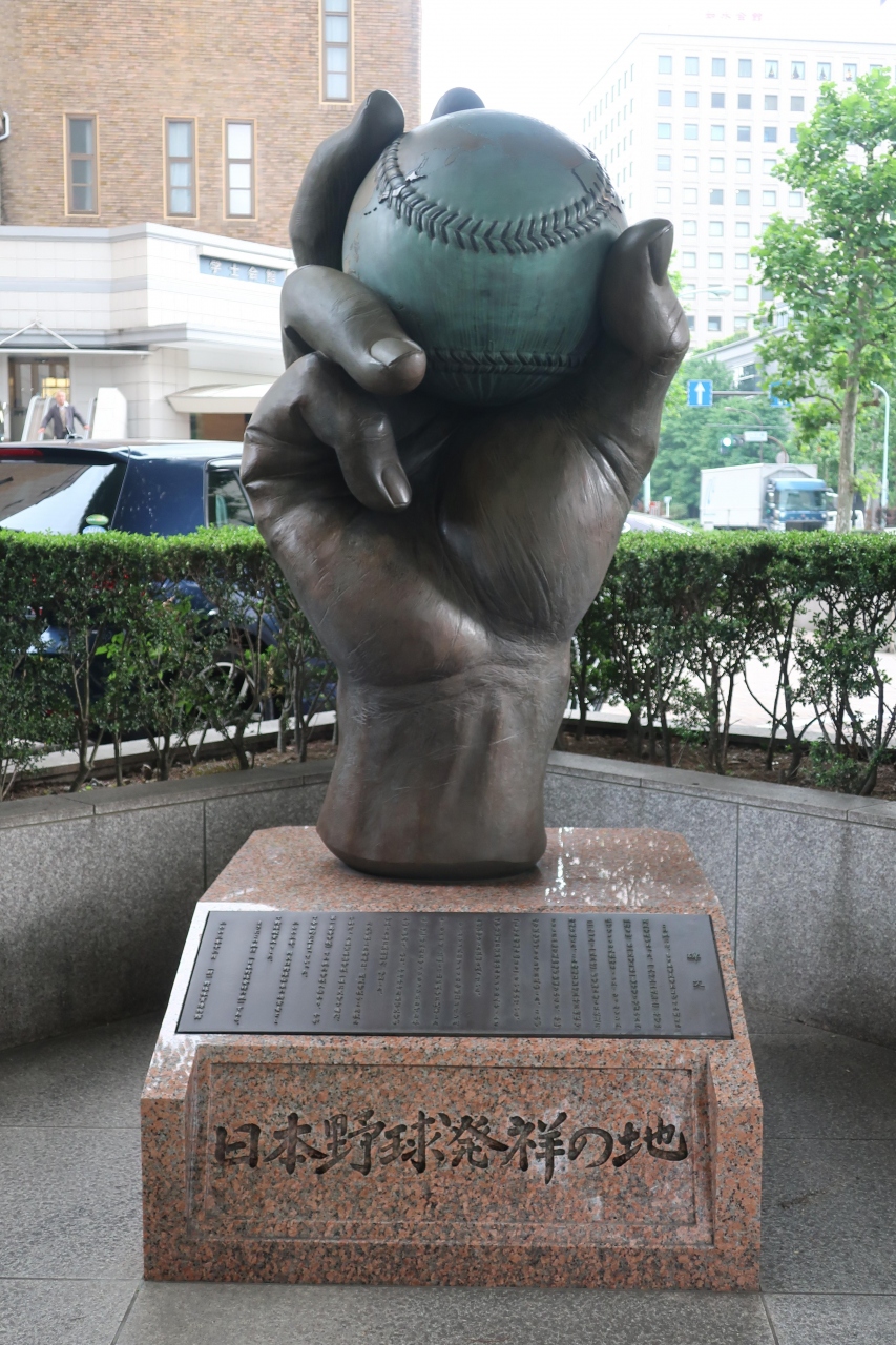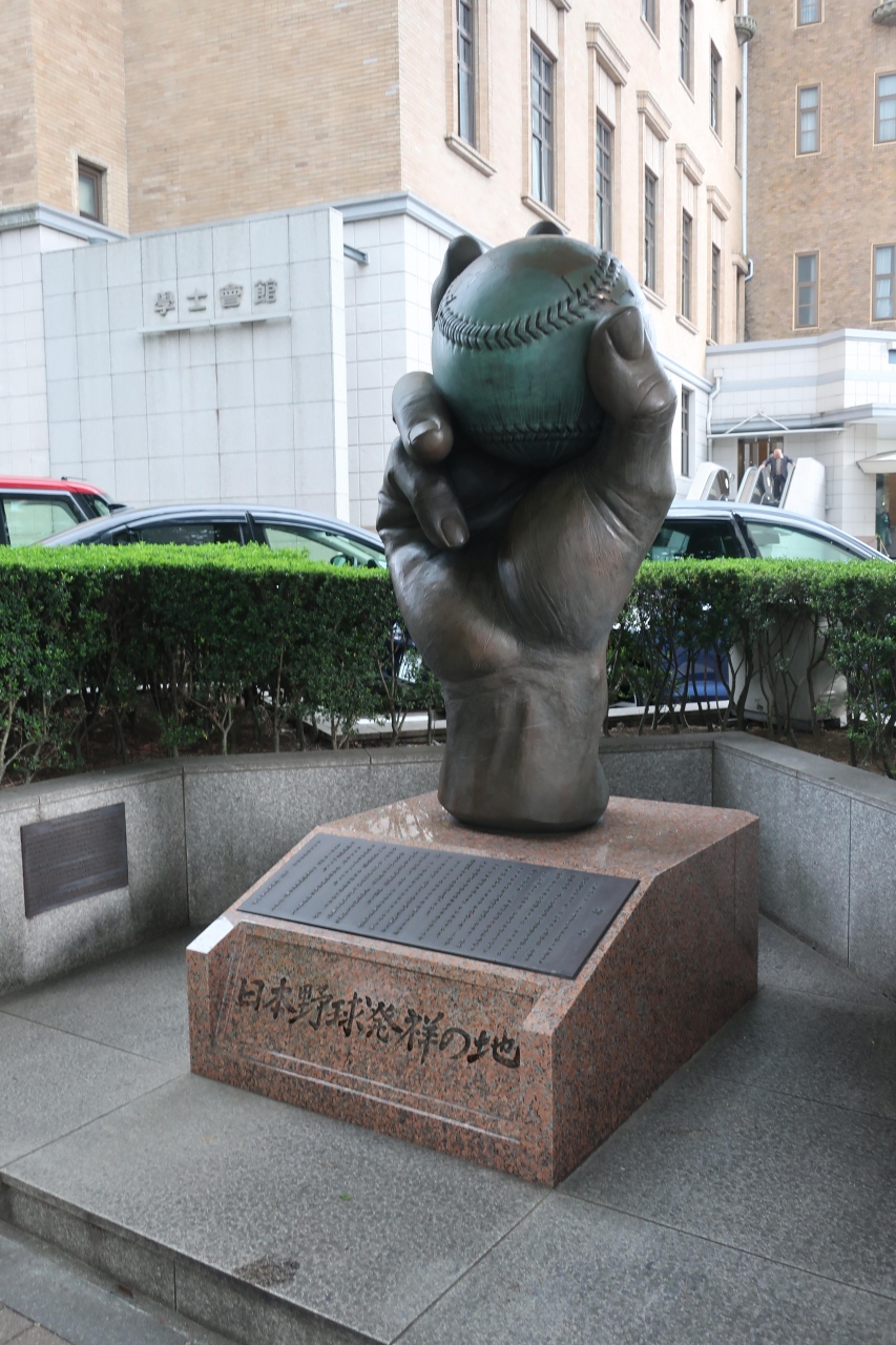 神保町にある学士会館北側の駐車場の一角にボールを握った手首の形をした碑が建てられています。これが日本野球発祥の地 記念碑です。東京大学の前身であった開成学校がこの地にあり、その運動場で野球が行われたことから日本野球発祥の地となっているそうです。