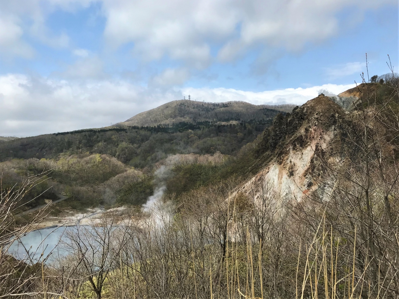 登別温泉通と呼ばれる道道350号線は、温泉街を越えてからは観光道路として大湯沼方面へと登って行き、この日和山展望台の前を通って、少し先の扇形展望台からクッタラ湖へと降りて行く片側一車線の道路ですが、きれいに舗装されていて走りやすい道路です。
