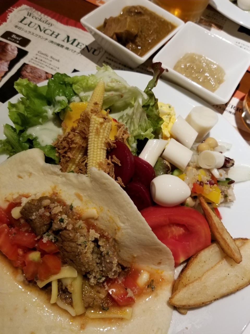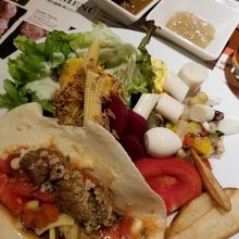 ランチタイムのサラダバーに、行きました。40種類のサラダ、ブラジル煮込み料理、ドリンクバー、デザート、チョコファンテンまでありました。タコスも、具材を自分で巻いて作れます!スパイシーなカレーもあります。プラスでお肉グリル料理を追加できますが、サラダバーだけで大満足でした!