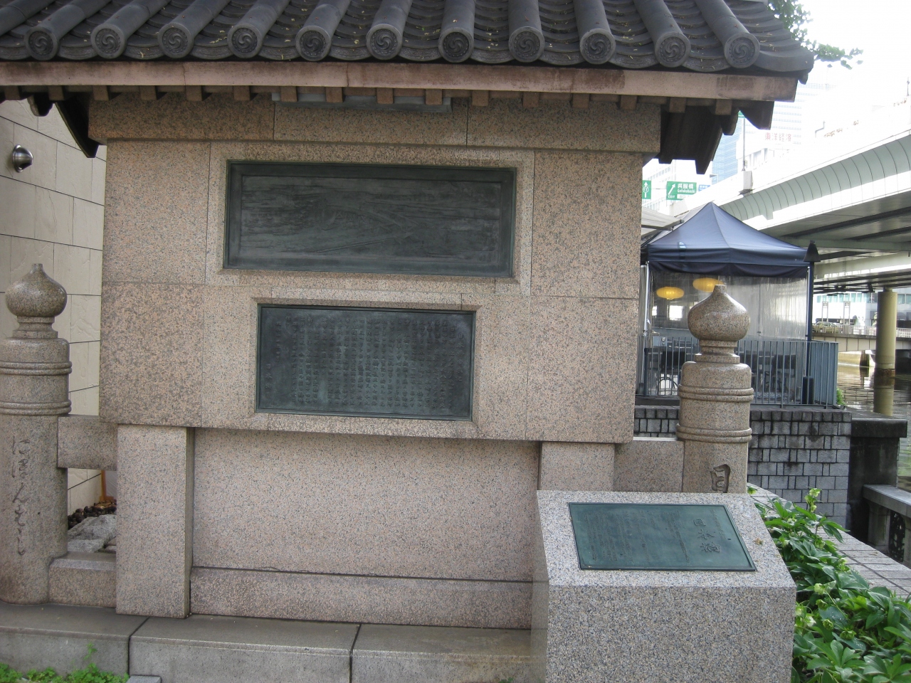 日本道路の起点となる日本橋川に架かる日本橋の南詰め西側、日本橋案内所前横に建つ由来記碑。江戸時代は高札場があった所で昭和11年(1936年)日本橋区が設置した碑です。碑の上部に安藤広重の絵が描かれているようですが残念ながら由来記も絵もどちらも年月の経過で分かりずらいです。