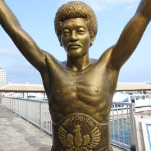 両手を挙げたモニュメントの横には、輝かしい経歴を刻んだ石碑もあります。