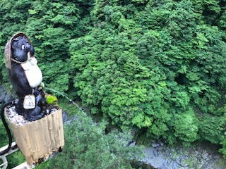 店内を通り抜けてテラスの利用もできます。祖谷の景色を眺めながら食事を楽しめます。テラスには小便たぬきがいます。魚やでこまわしも販売されています。揚げそばはあまじょっぱいしっかりめの味付けの揚げでした。祖谷そばはプチプチ切れやすいそうですが、こちらはあえて喉越しよく作っているそうです。