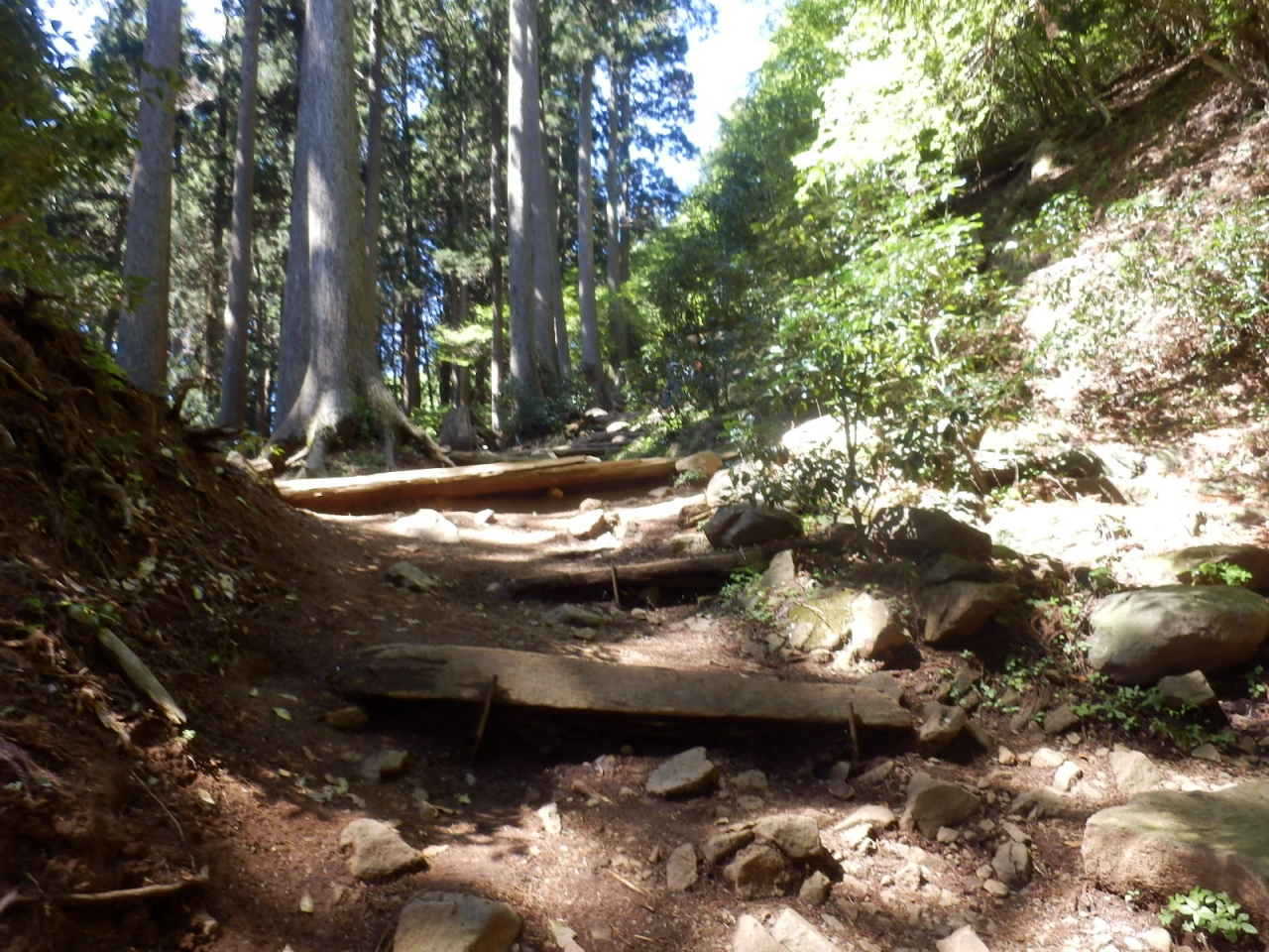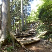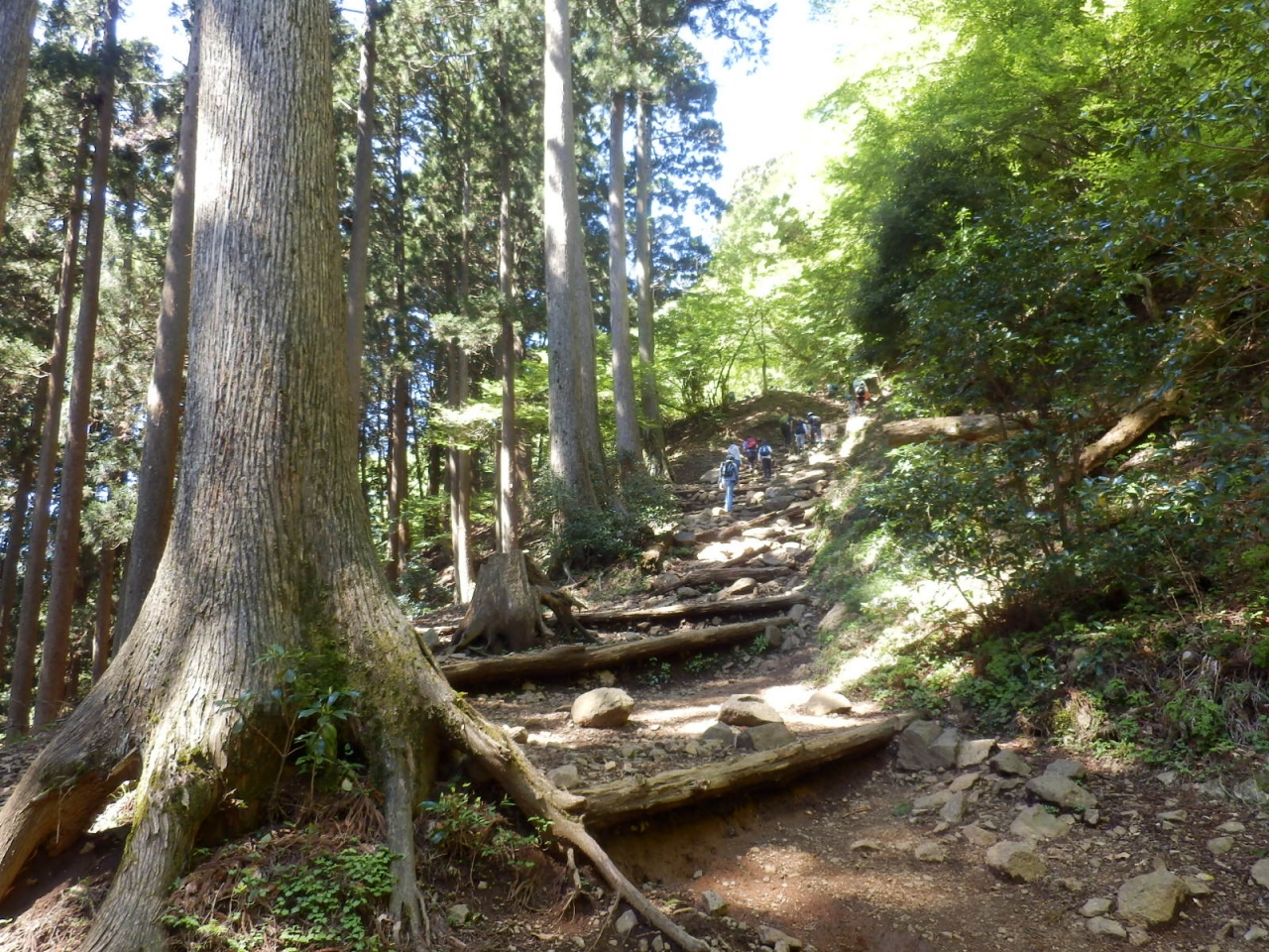 阿夫利神社の下社の脇に登山道の入口があります。まずは急な石段を登り、夫婦杉を通り過ぎると、杉が綺麗に並ぶ登山道となります。急坂で、足元も悪いため、地面ばかりを見て歩いてしまいましたが、上を見上げると、杉に囲まれていました。日差しの強い暑い日でしたが、杉のおかげで、日陰となっていて、風が心地よかったです。
