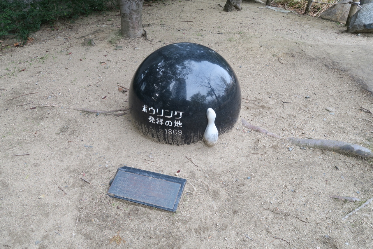 1869年にボウリングがここで発祥した事を記念するモノだが、1/3土に埋まったボウリング球の姿がなんとなく印象的。ボーリングのピンが隣に忘れたかのように添えられているのが面白い。