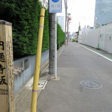 青山通りから薬研坂を下って再び登り、道教寺のそばから東に下っていく坂があります。この坂の途中に「円通寺」があることから、「円通寺坂」と名前がついていることが木製の説明書きから知ることが出来ました。ひねりの無いネーミングだと思いますが、覚えやすいことは確かですね。T字路のところが建築工事中で、トラックなど出入りが多く気を付けて歩きました。