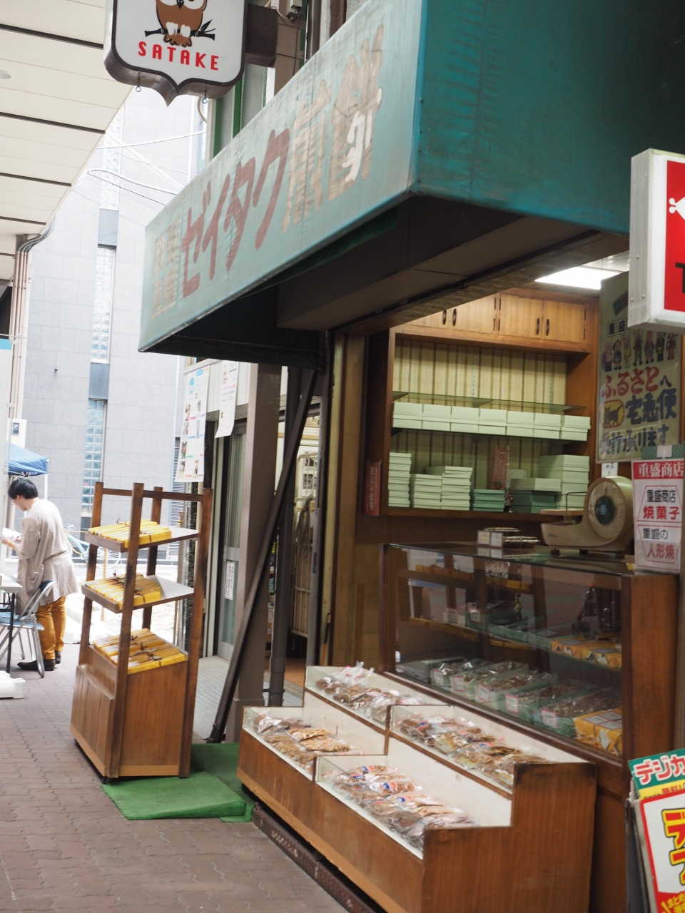 台東区にあるアーケード商店街、佐竹商店街の中にあります。古びた雰囲気の瓶が並ぶ店先は下町レトロの趣があります。店名はせんべいとありますが、実際には人形焼が店頭に並んでいました。自宅向きの簡易包装のものもあるのでちょっとしたおみやげによさそうです。