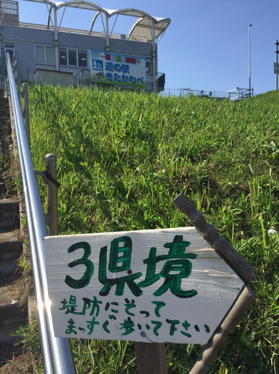道の駅の駐車場横の階段を降りて堤防下の道を歩いていきます。