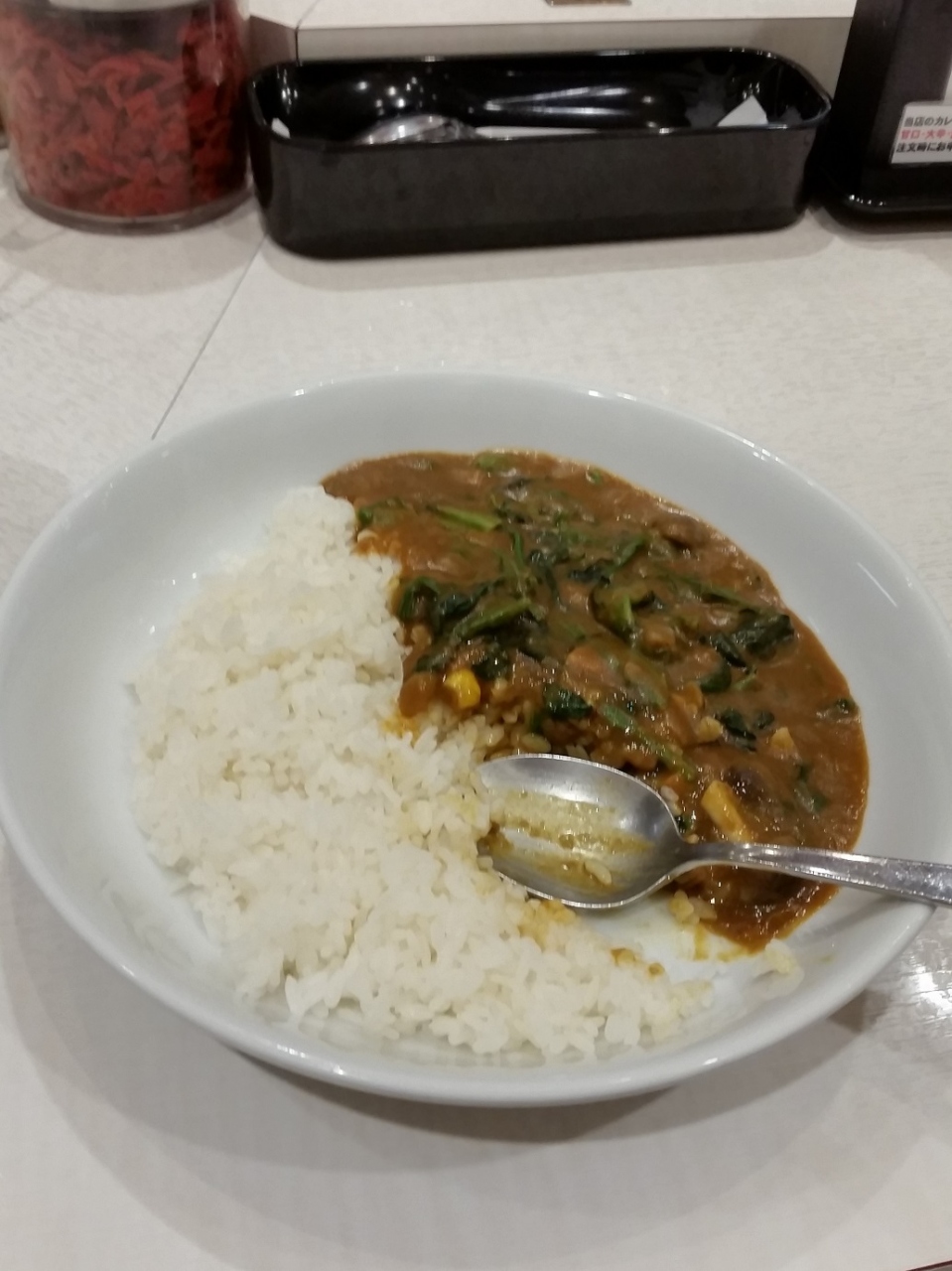相鉄ジョイナスの地下にあり、横浜市営地下鉄の改札を出てすぐの場所にあります。店内に入ると券売機があり、そこで好みのメニューを選んでボタンを押せばOKです。カウンターの後ろには荷物用の籠が置いてあるので、ビジネスバックなどはここに入れておけば食事の時にも苦になりません。温かい気配りが感じられました。私は「ほうれん草カレー」を頂きましたが、味は程よい辛さで万人受けする無難なところでした。