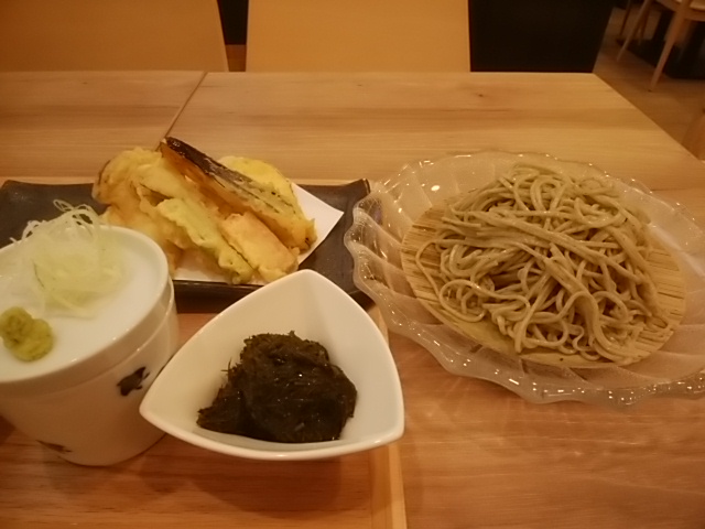 野菜は、なす、かぼちゃ、さつまいも、まいたけ、えりんぎなどがさっくり揚がっています。細目のそばは、冷たくしめられて、いい歯ごたえ。