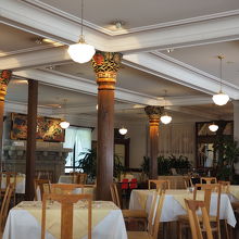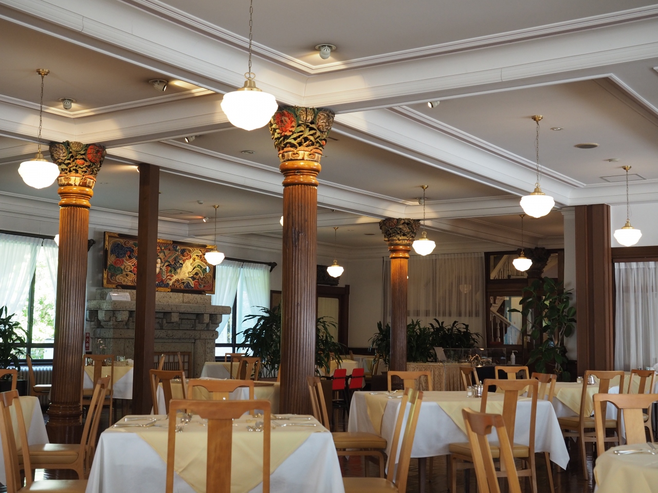 日光金谷ホテルの2階にあるレストランです。昔はここがロビーだったそうで、柱頭にひとつひとつ木彫りの花があったり、石組の暖炉があったり、お店のインテリアにも歴史と趣があります。窓側の席はもみじの緑が美しく明るい雰囲気ですてきでした。