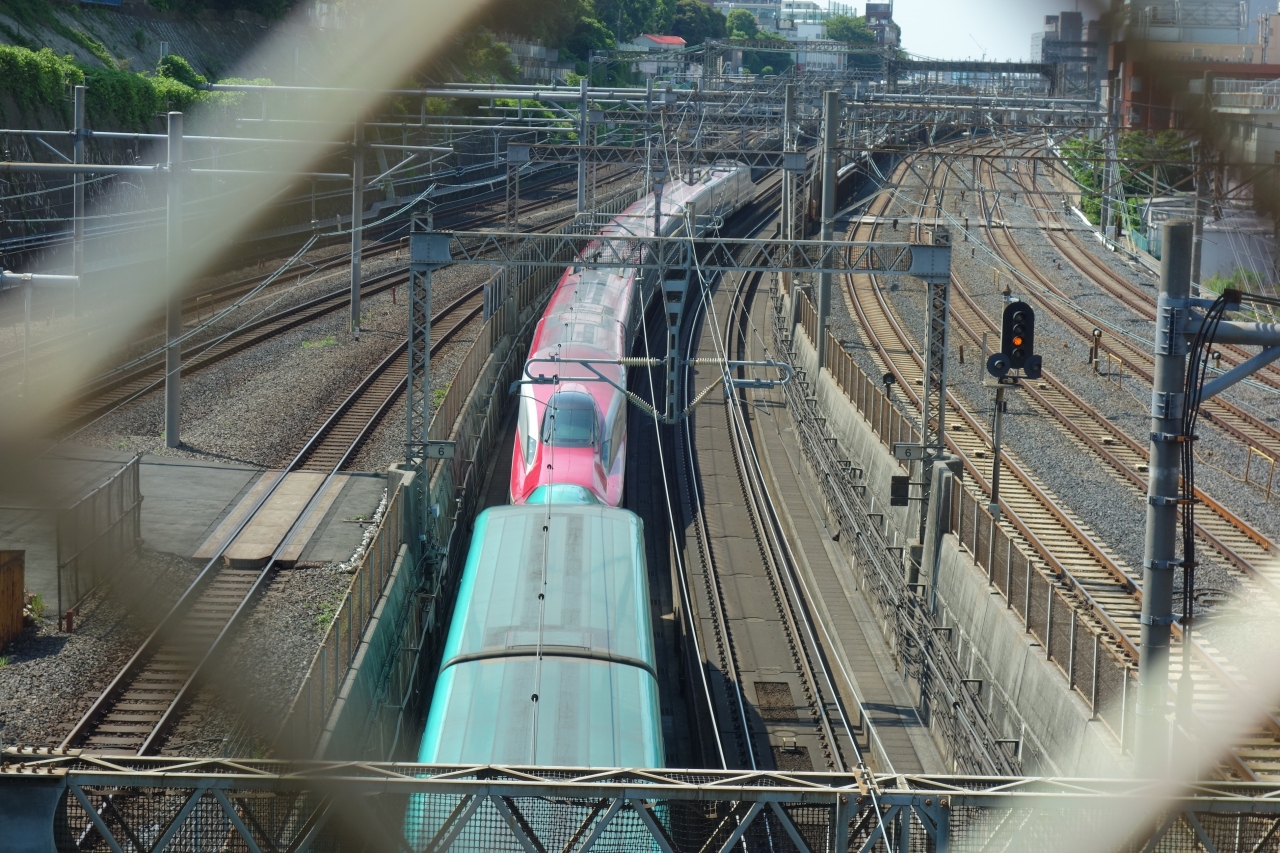 新幹線が足元から姿を現すのって珍しいですよね。新幹線の真上だけはバッチリ金網が張られてます。