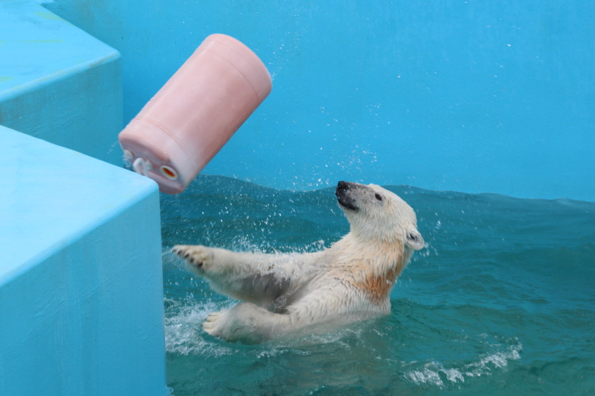 テレビで取り上げられることが多く、すっかり全国区になったホッキョクグマのミルクですが、訪れた時も相変わらず遊び上手で、飽きずに繰り返していました。一人でやっていて面白いのかなと思いましたが、時々、見物者がちゃんと見てくれているか確認するような仕草をするのが可愛いかったです。