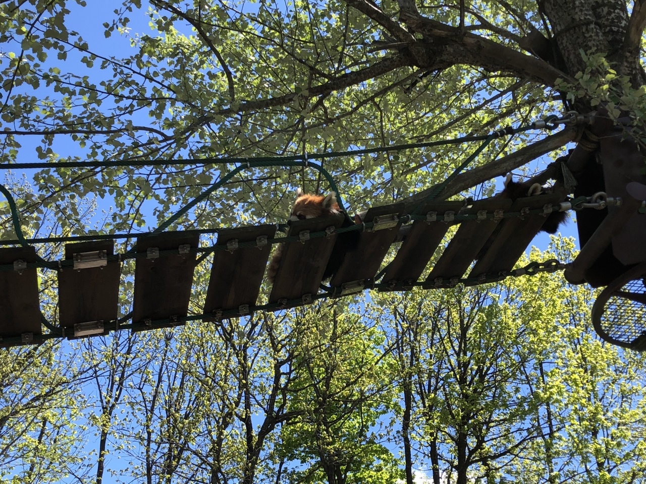 レッサーパンダ舎と通路を挟んだ樹木に吊橋がかかっていて