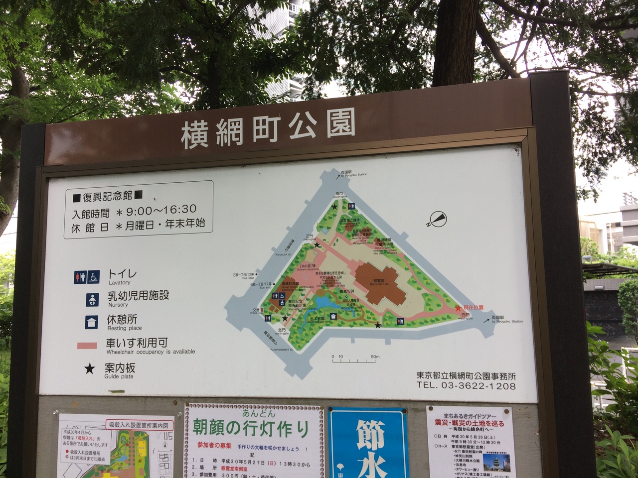 JR総武線両国駅から見ると国技館の裏手(北側)に当たる場所にある公園です。この公園は、関東大震災と第二次世界大戦の空襲による犠牲者の遺骨が納められた納骨堂があり、これらの東京都慰霊堂やその惨事を記録した東京都復興記念館もあります。園内は緑が多く普段はとても静かな場所です。