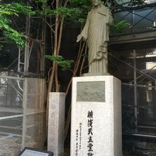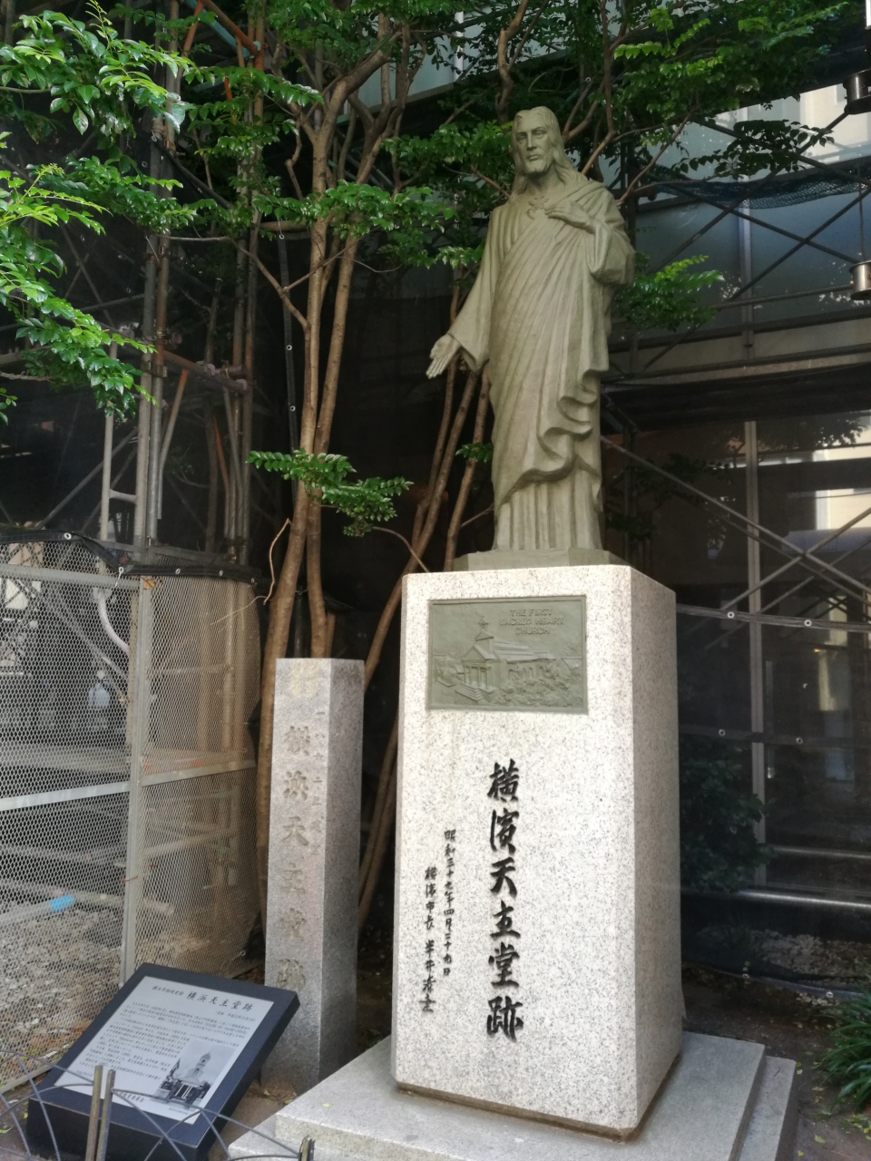横浜の関内周辺を歩いていると、当時の歴史的建造物も数多く残っいていて、町のあちこちで「日本の○○の発祥の地」とか「○○の跡」書かれた看板をよく見かけますが、中華街の東門のそばの地下鉄の駅に下りる階段の横に、中華街らしからぬ、横濱天主堂跡と説明プレートのあるキリスト像があります。
