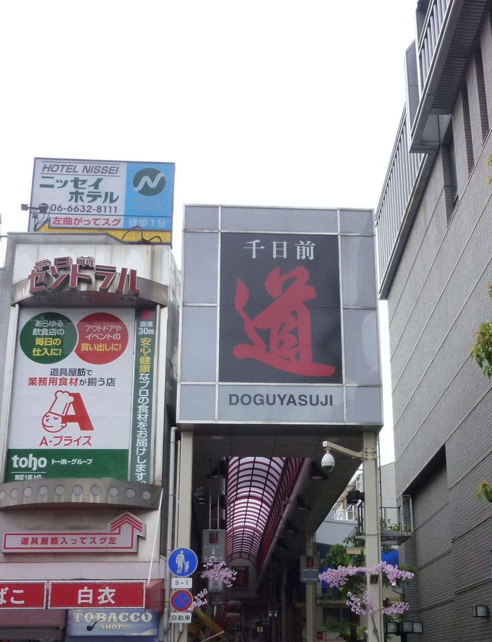 なんばグランド花月前から南を向くと、目に入りました道具筋の看板。ここを通れば、飲食店のグッズが全て揃うと思う程。包丁や食器の料理道具から、お店の前に出す提灯、店先に並べる食品サンプルまで、免許があれば明日から開店です。