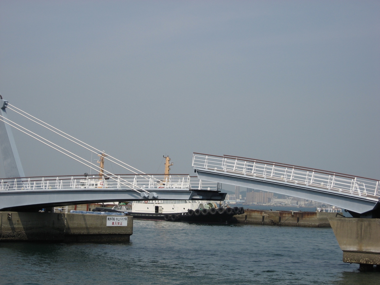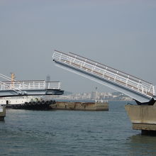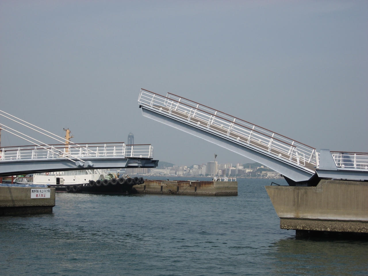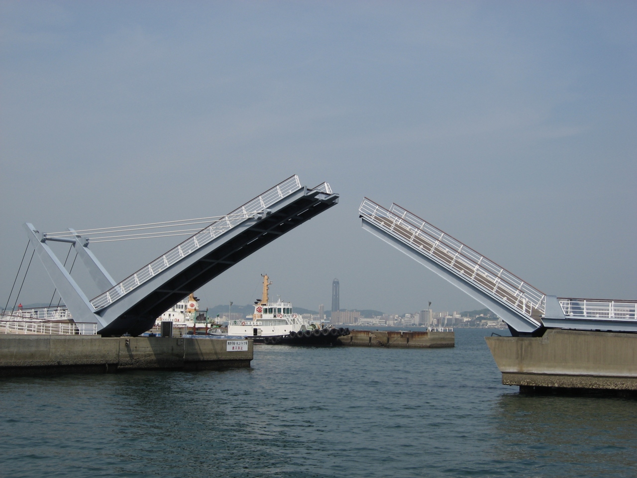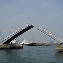 通行を止めてからゆっくりですが、左右の橋が段々と上がっていきます。