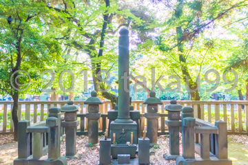 上野恩賜公園の中にある上野の森美術館の前の木立の中にあります。円柱形の石塔のまわりに石灯籠が並んでいます。更にその周りは石柵で囲われています。深い緑で覆われていているため薄暗くすこし薄気味悪い感じがしました。