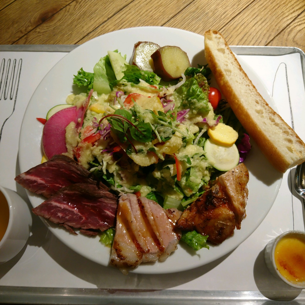 ランチにて利用致しました。今回はごちそうサラダにしました。サラダに、お肉三種がもられております。ドレッシングも種類があり、好きなものを選べるので季節限定のリンゴにしました。サラダですがほどよくボリュームもあり、よかったです。