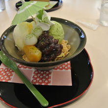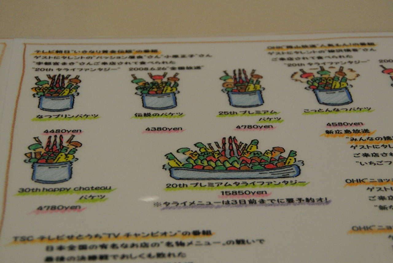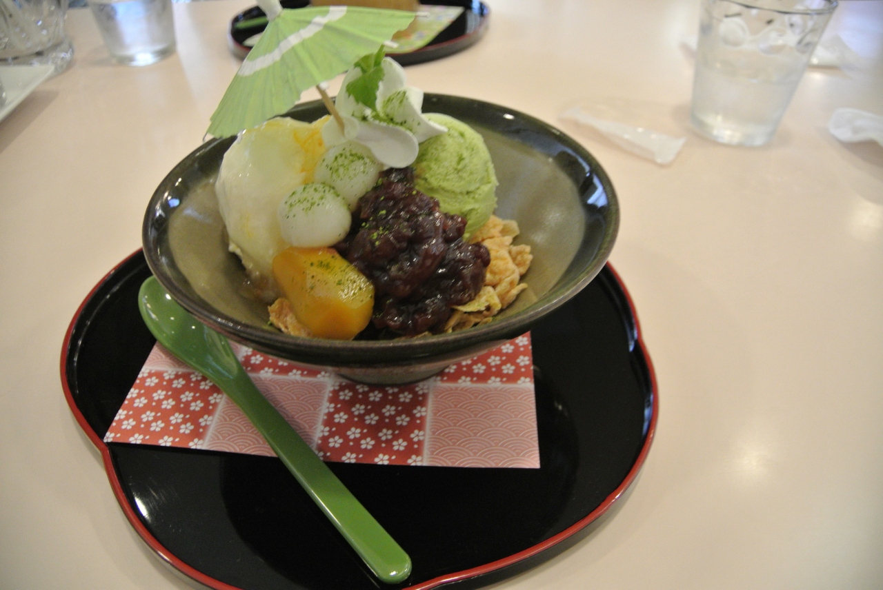 バケツパフェというバケツのような大きな器に入ったパフェが名物ですが、さすがに食べきれないので、普通のパフェにしました。柚子パフェは柚子アイスクリームのほかに抹茶アイスもはいっていました。傘の飾りがかわいい。けっこうテレビの取材とかが来ているみたいで、壁に写真やサインが飾ってありました。
