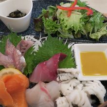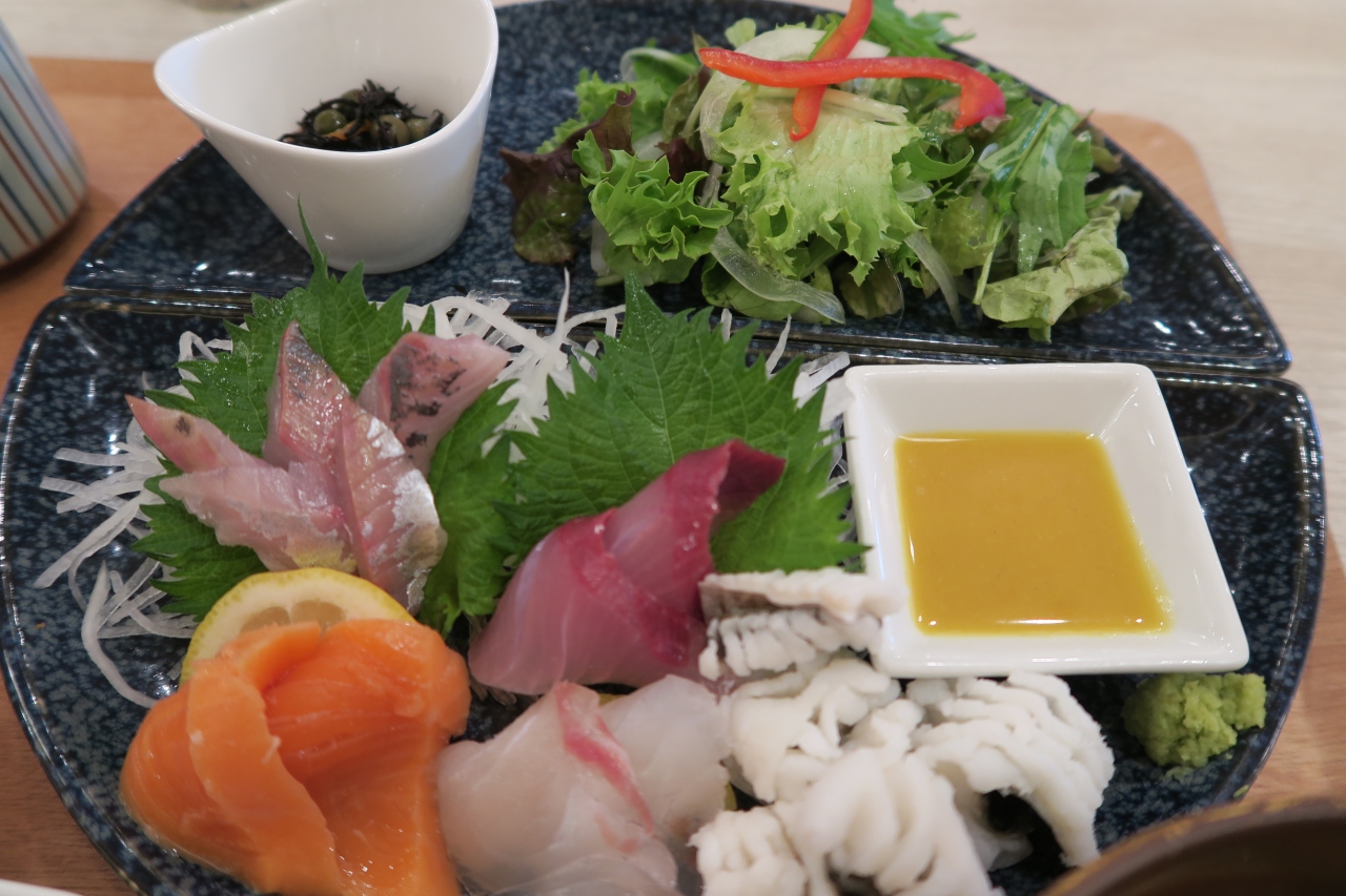 JR呉線の呉駅の駅ビル1階に最近できたカフェレストランです。喫茶やワッフルなどのカフェメニューもありますが、お昼は普通のお食事中心。和食から麺類など幅広く、最近のファミレス的というのか。店内はまだ新しく明るく清潔です。お客さんは平日昼の地元の方が中心。こういうお店では地雷っぽい刺身定食を頼んでしまいましたが、さすがに港町らしく刺身はちゃんとしてました。1400円くらいのお値段ながら鱧もついていてお得な感じ。