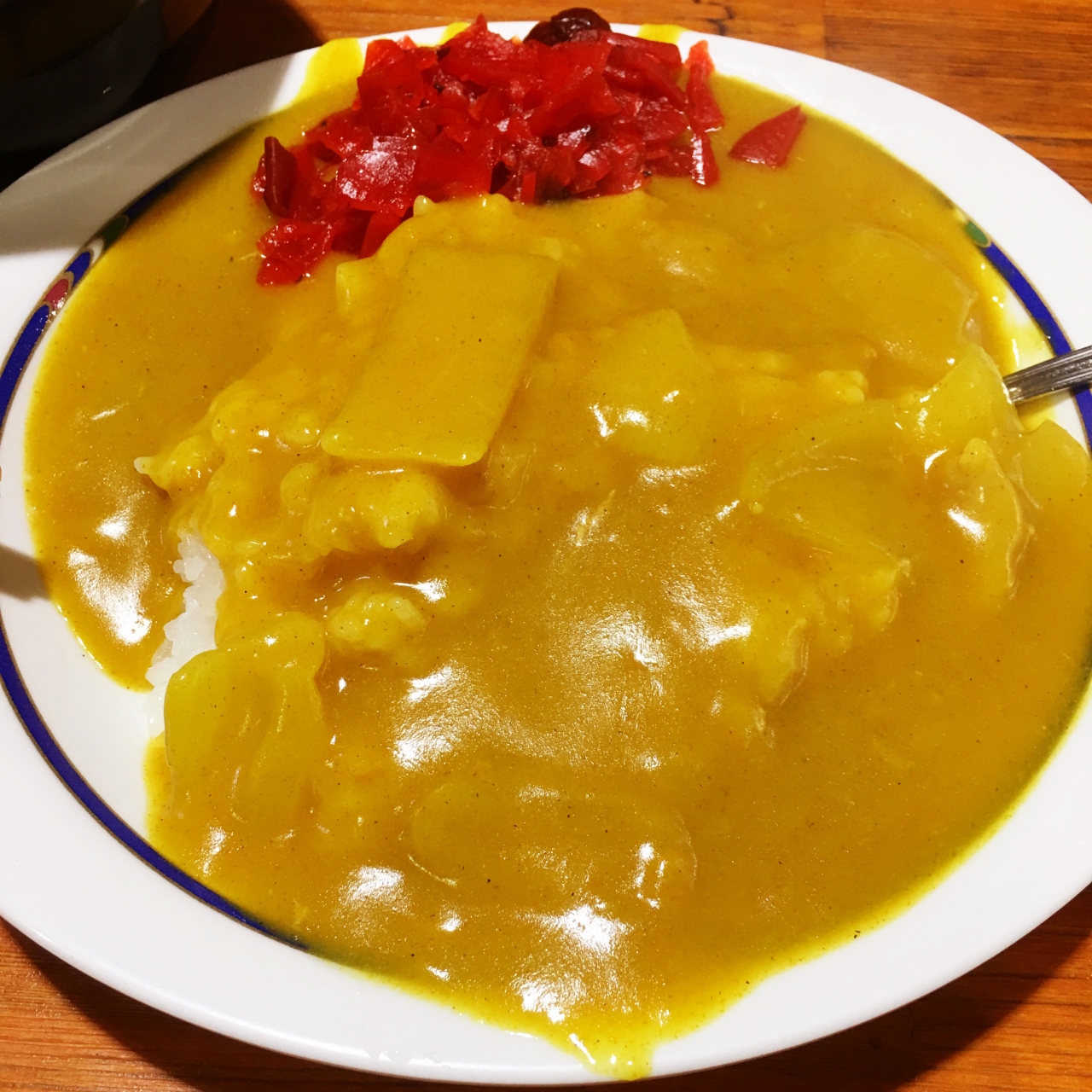 黄色いバスカレーは見た目よりもスパイシーで朝から発汗を促してくれて美味しいです。