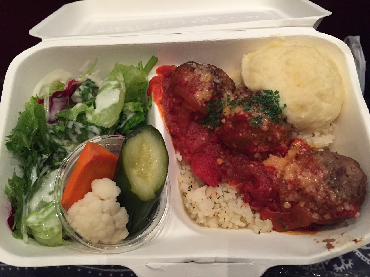 日比谷ミッドタウン地下1階にある ミートボール専門店 スーザンミートボールさん。店内でもテイクアウトでも可能です。ミートボールボックスを注文。ミートボールが3個、マッシュルーム、ライス、サラダ、ピクルスとボリューム満点でした。