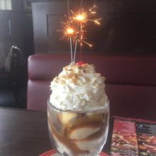 私のお勧めは写真のハンバーガーです。もう肉料理という感じでボリューム満点です。この日は他にもパスタなどを注文しました。ランチタイムのメニューはそれほど高くないのでコスパはよいと思います。また、こちにのお勧めは誕生日のサービス。花火付きのパフェは記念写真がもらえます。